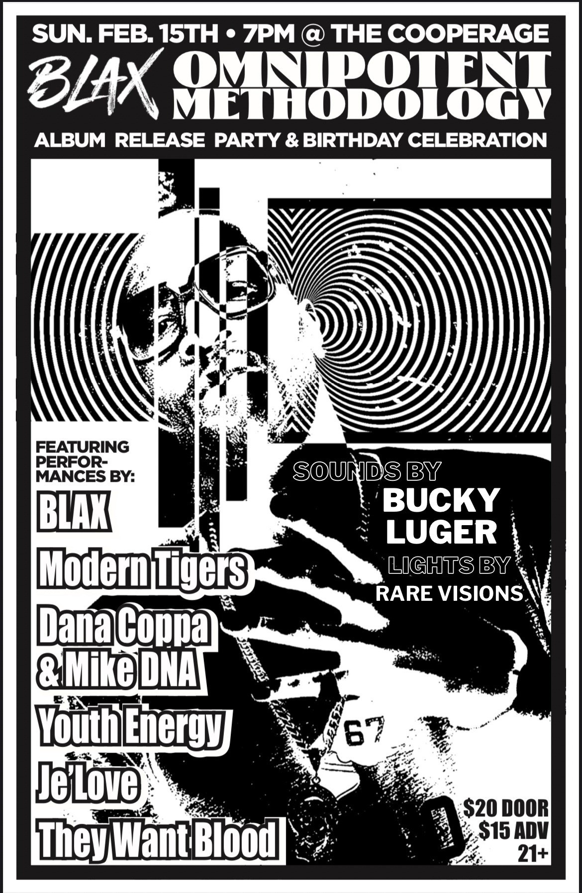 9:40 PM - BLAX closes the night with a full performance of Omnipotent Methodology—jazz-influenced conscious hip-hop in the tradition of MF DOOM and J Dilla. The birthday boy performs the album that represents the culmination of two decades of independent artistry, now pressed to vinyl.