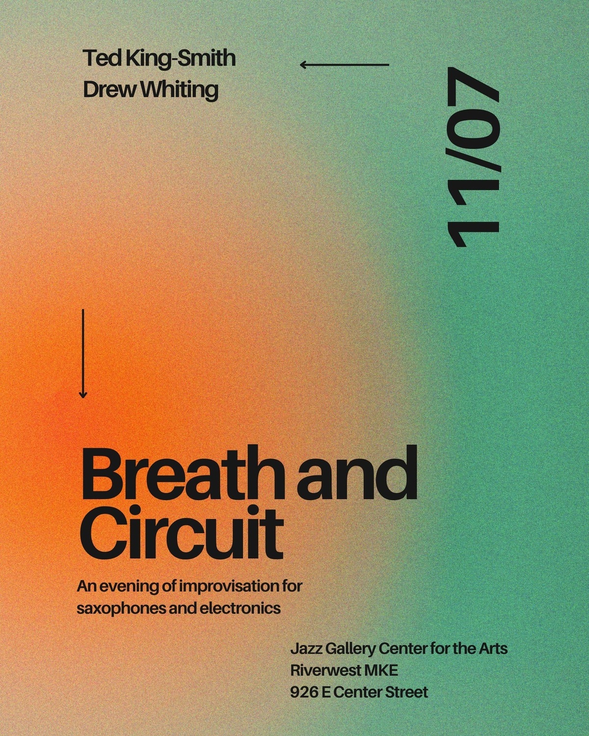 Breath and Circuit, a new project from Ted King-Smith (MATC/UWM) and Drew Whiting (UWO), blends the spontaneity of improvisation with the soundscape of ambient and contemporary genres. Utilizing saxophones, synthesizers, found sounds, and live processing, the duo creates unique and captivating sonic environments with each performance.