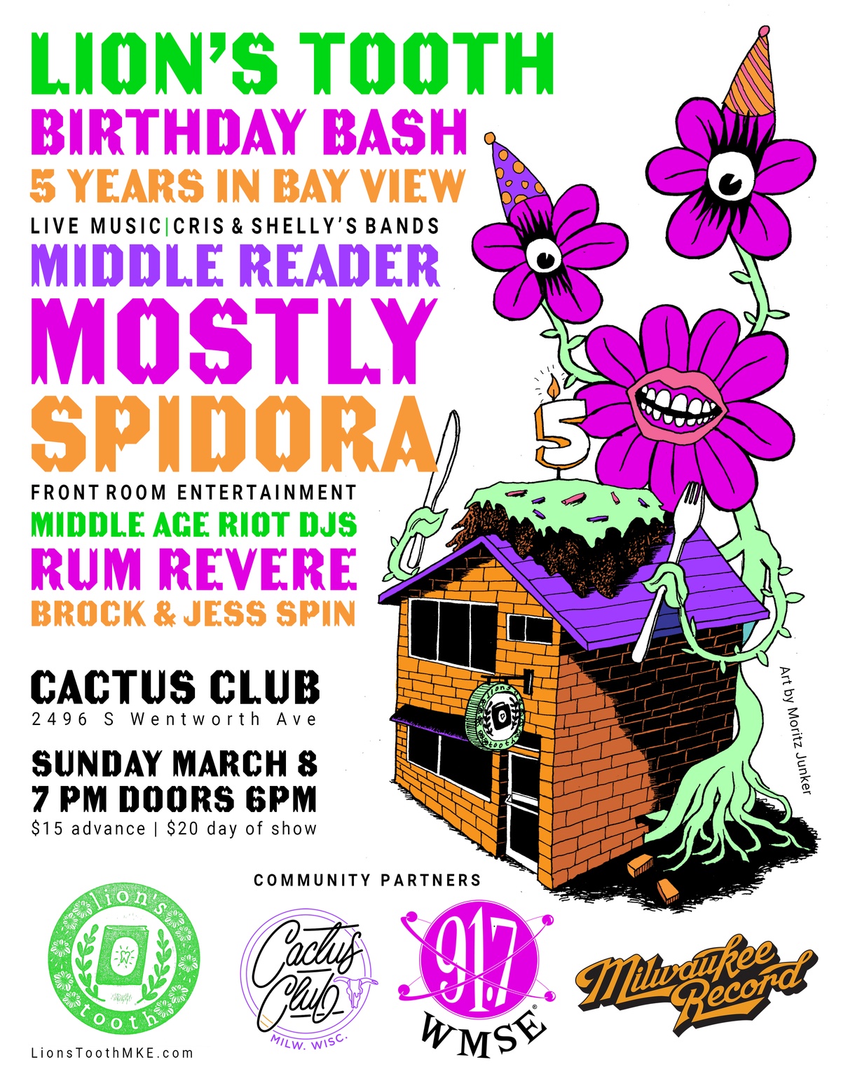 Please join us for a celebration of the fifth anniversary of Lion’s Tooth storefront in Bay View. Live shows by musical projects of Lion’s Tooth co-owners Cris and Shelly: Middle Reader (Shelly’s band), Spidora (Cris’ band), Mostly (Cris and Shelly’s band together) plus front room entertainment: a set by Rum Revere, WMSE’s Middle Age Riot DJs (including Shelly again!), and a record spin by Brock Gourlie and Jess Ader. This is a fundraiser for Lion’s Tooth with community support from Cactus Club, WMSE and Milwaukee Record.