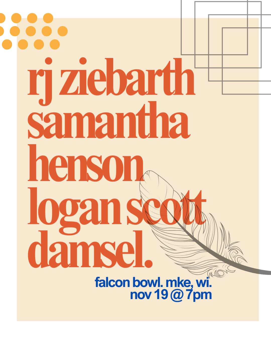 Four singer-songwriters, one intimate night. Come on out to Riverwest’s very own Falcon Bowl to support local artists/musicians Logan Scott and R.J. Ziebarth + out of towners Damsel. and Samantha Henson as they make their Falcon Nest debut.